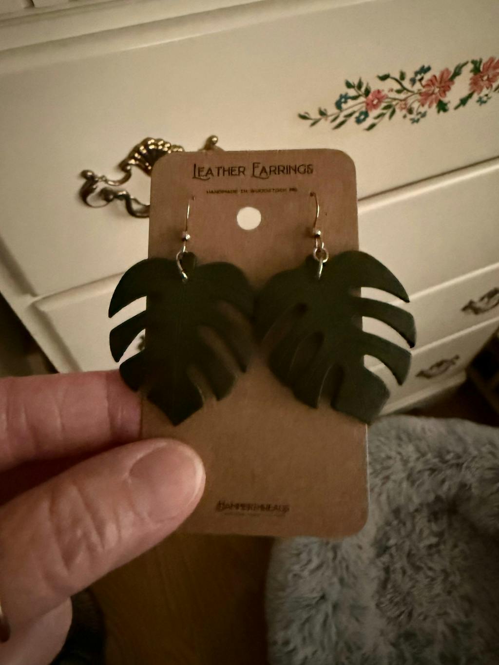 Cut from full grain vegetable tanned leather and hand dyed using water based dyes, each pair of monstera earrings is strung on a nickel free fish hook style earring with silicon backs to keep them secure.
