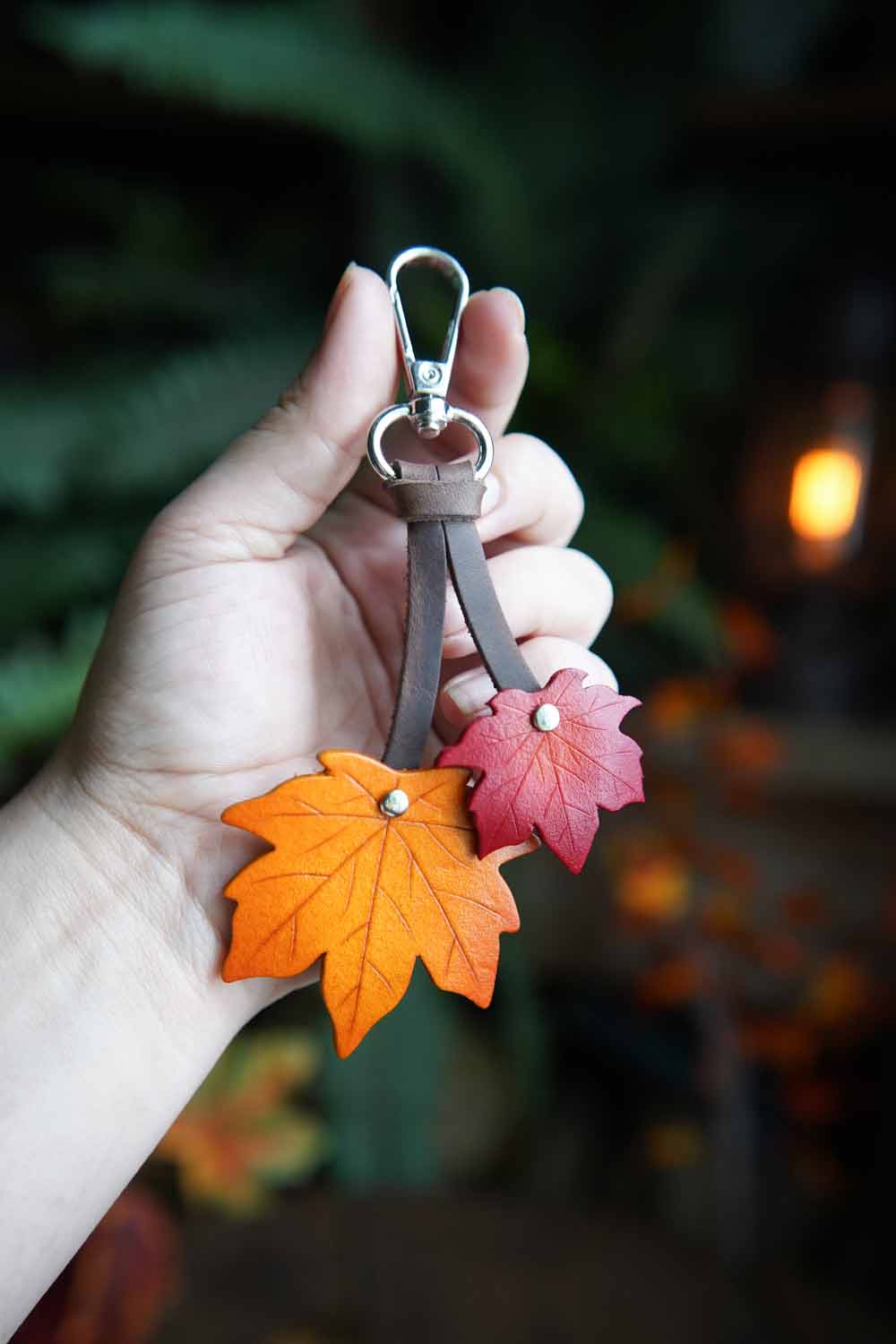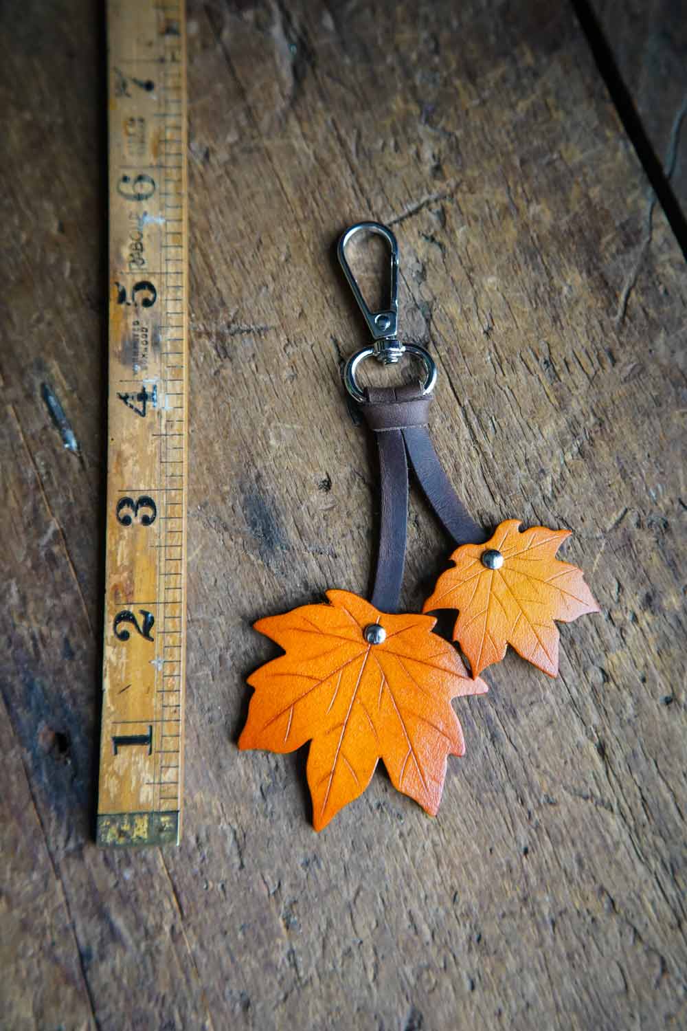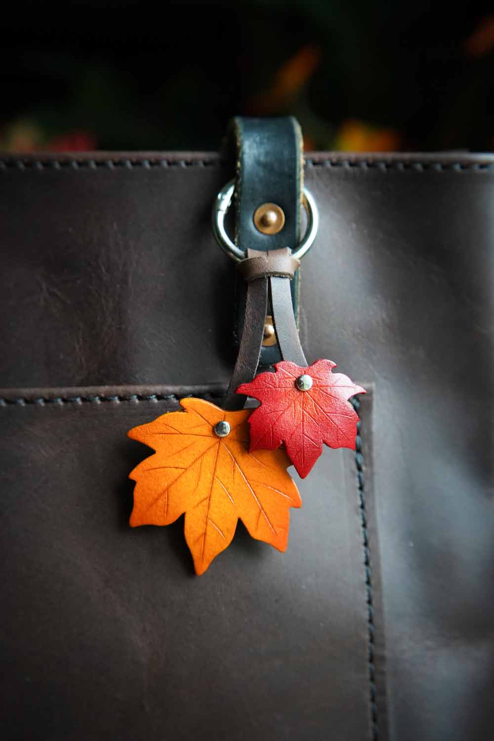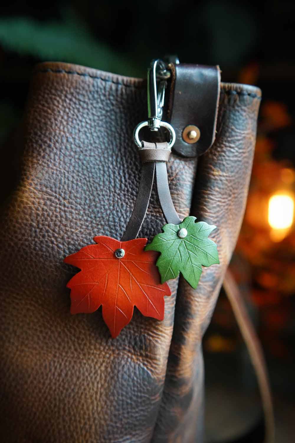 Our leather maple leaf bag charm now in a smaller size! The perfect seasonal gift, these uniquely handmade maple leaves will bring a touch of natural magic to your key ring or make a bold bag charm. Choose just the right colors to match your tote or purse!