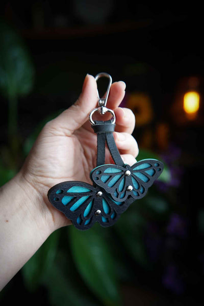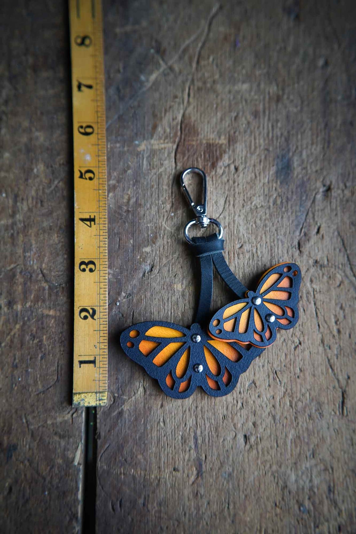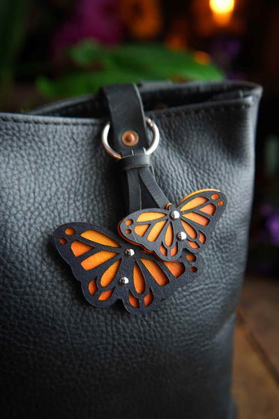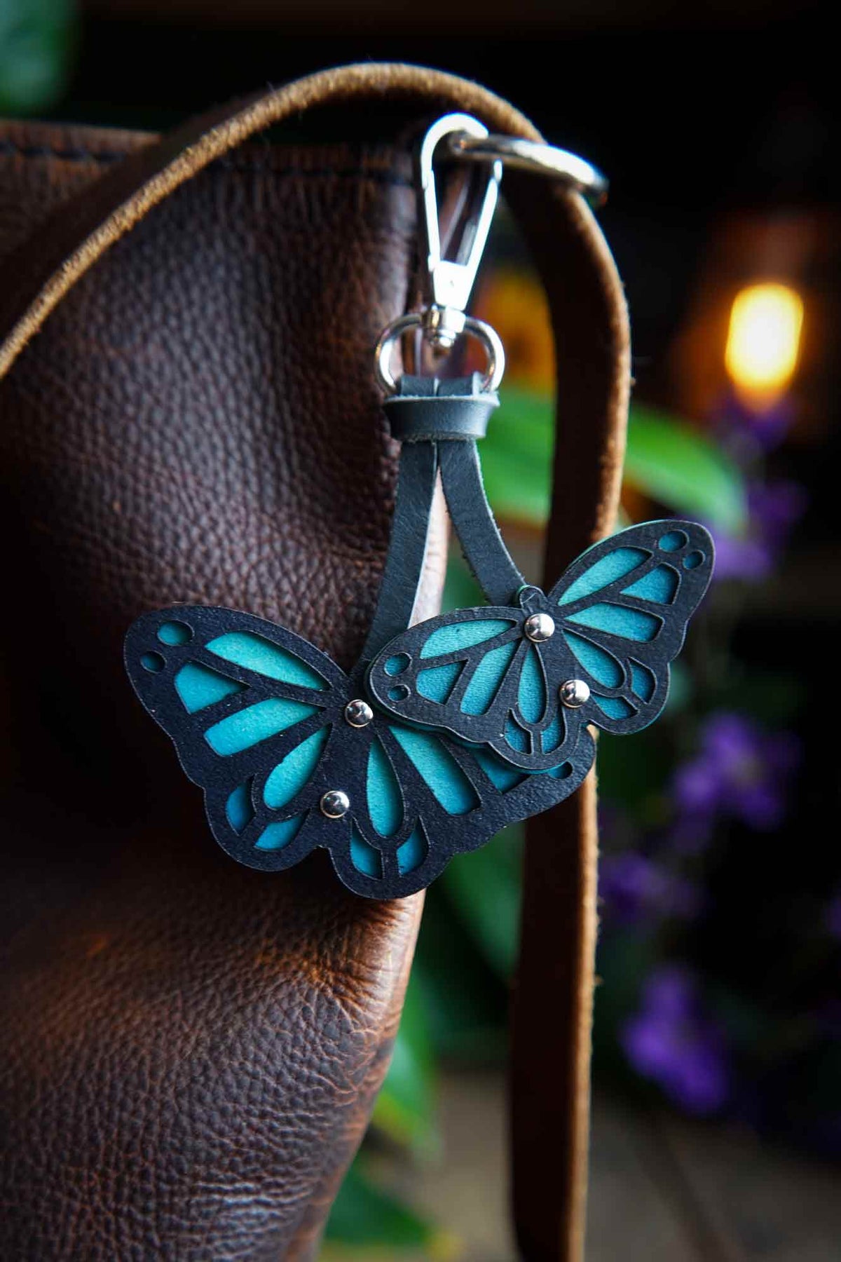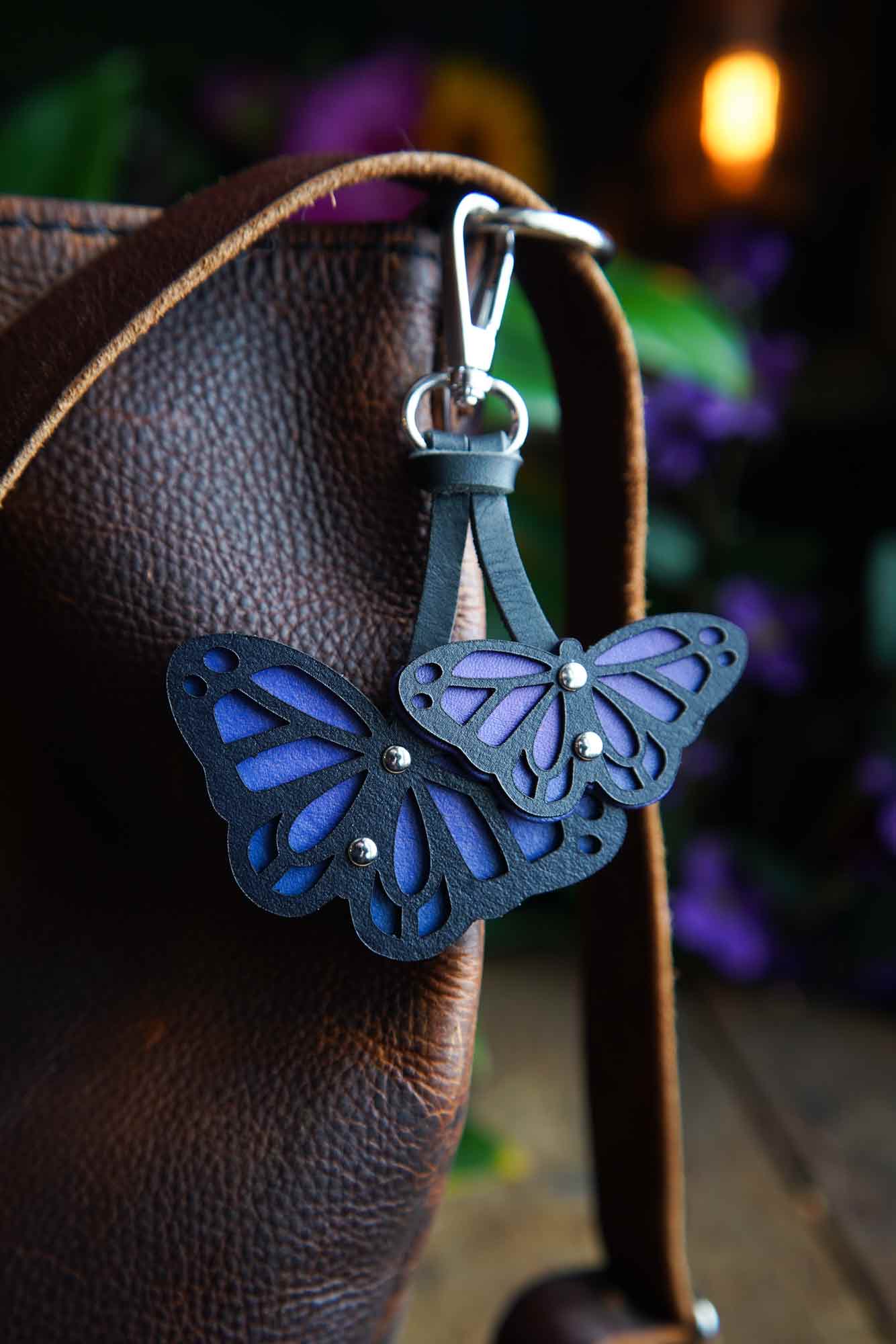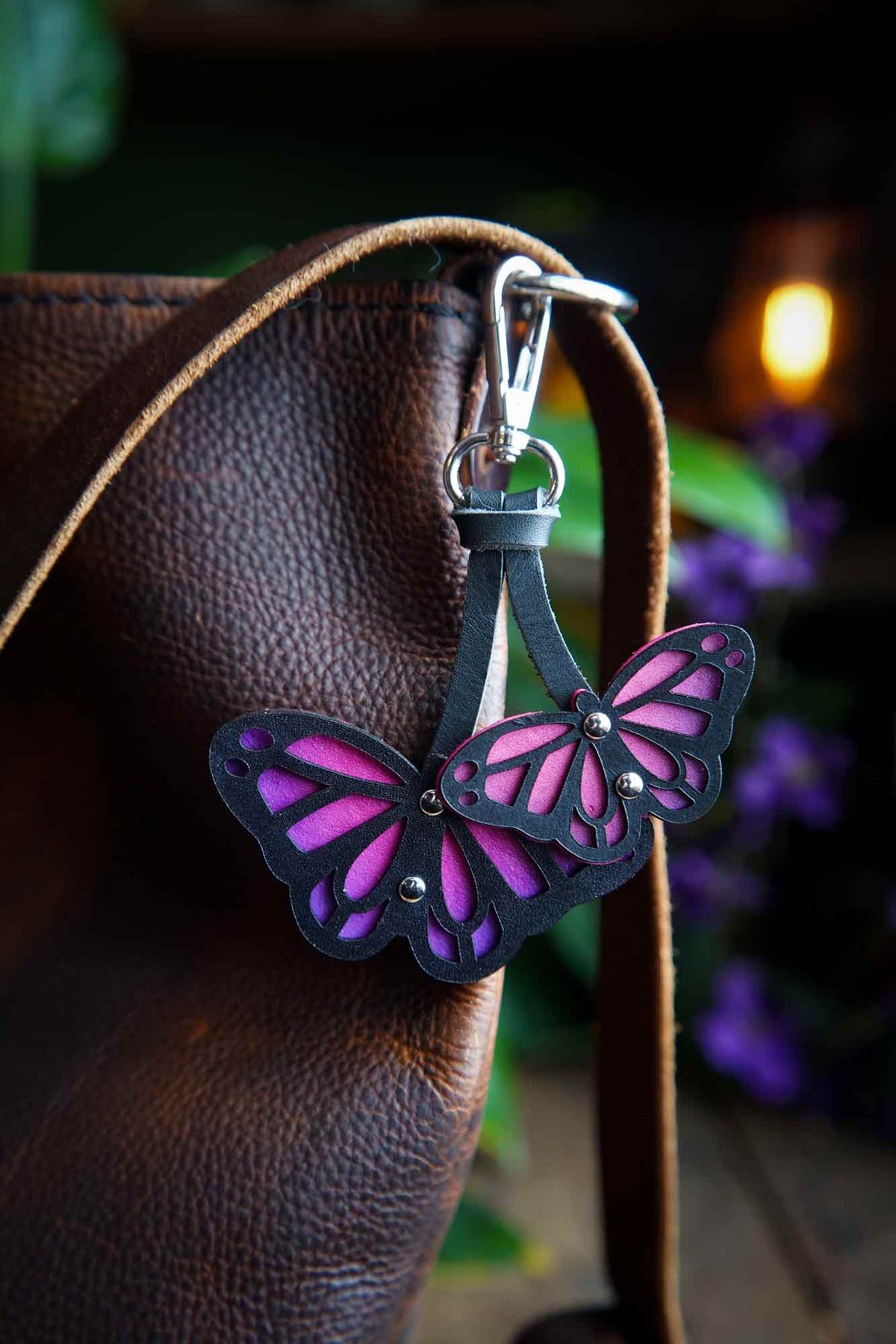 A vibrant leather butterfly bag charm to bring some natural magic to your day. The perfect accessory to add a touch of whimsy to your purse or keyring. The intricate wing cut outs allow the bold hand dyed colors to show through creating a lovely layered effect.