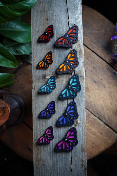 Cut from full grain vegetable tanned leather and hand dyed using water based dyes. Each butterfly is riveted to your choice of hardware using a solid brass rivet.