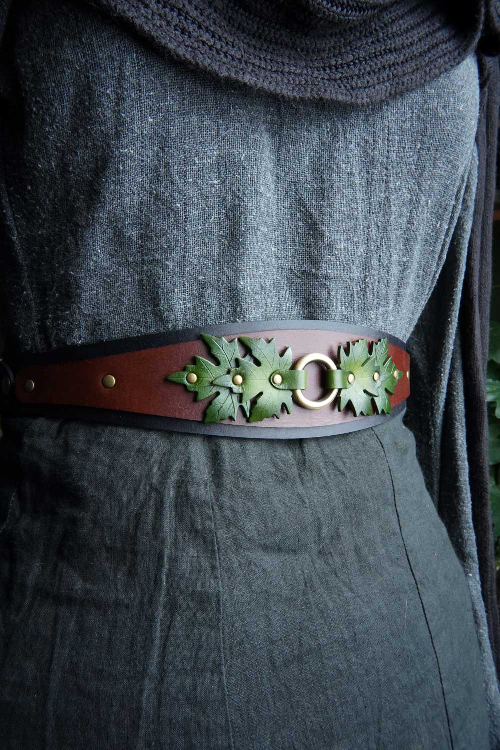 Each belt will feature a set of hand crafted sugar maple leaves anchored together with a thick steel ring and solid brass rivets. The soft yet sturdy leather ties allow for a free flowing fit.