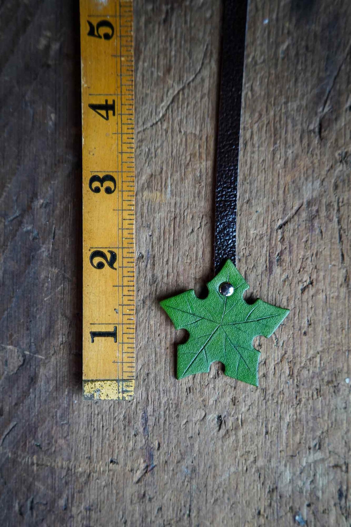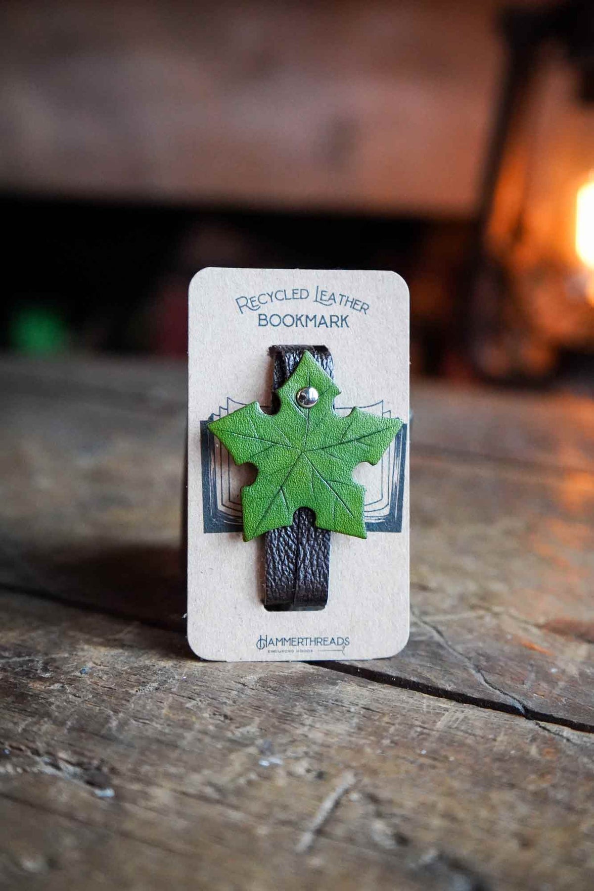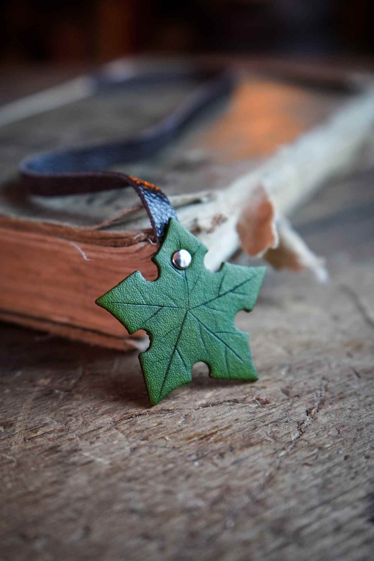 Our handmade recycled leather bookmarks are a favorite for good reason. Uniquely hand carved, the leather leaf is riveted to soft and supple recycled leather that sits perfectly between the pages of your favorite book. Specifically designed not to slip out or leave unsightly bumps and bends like thicker leather bookmarks.