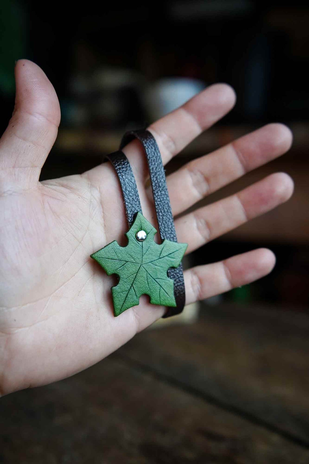 The leaf itself is made with vegetable tanned leather while the lace will be a lighter weight upholstery or garment leather in shades of brown. The leather used will vary as we source it from factory remnants giving new life to these valuable textiles.