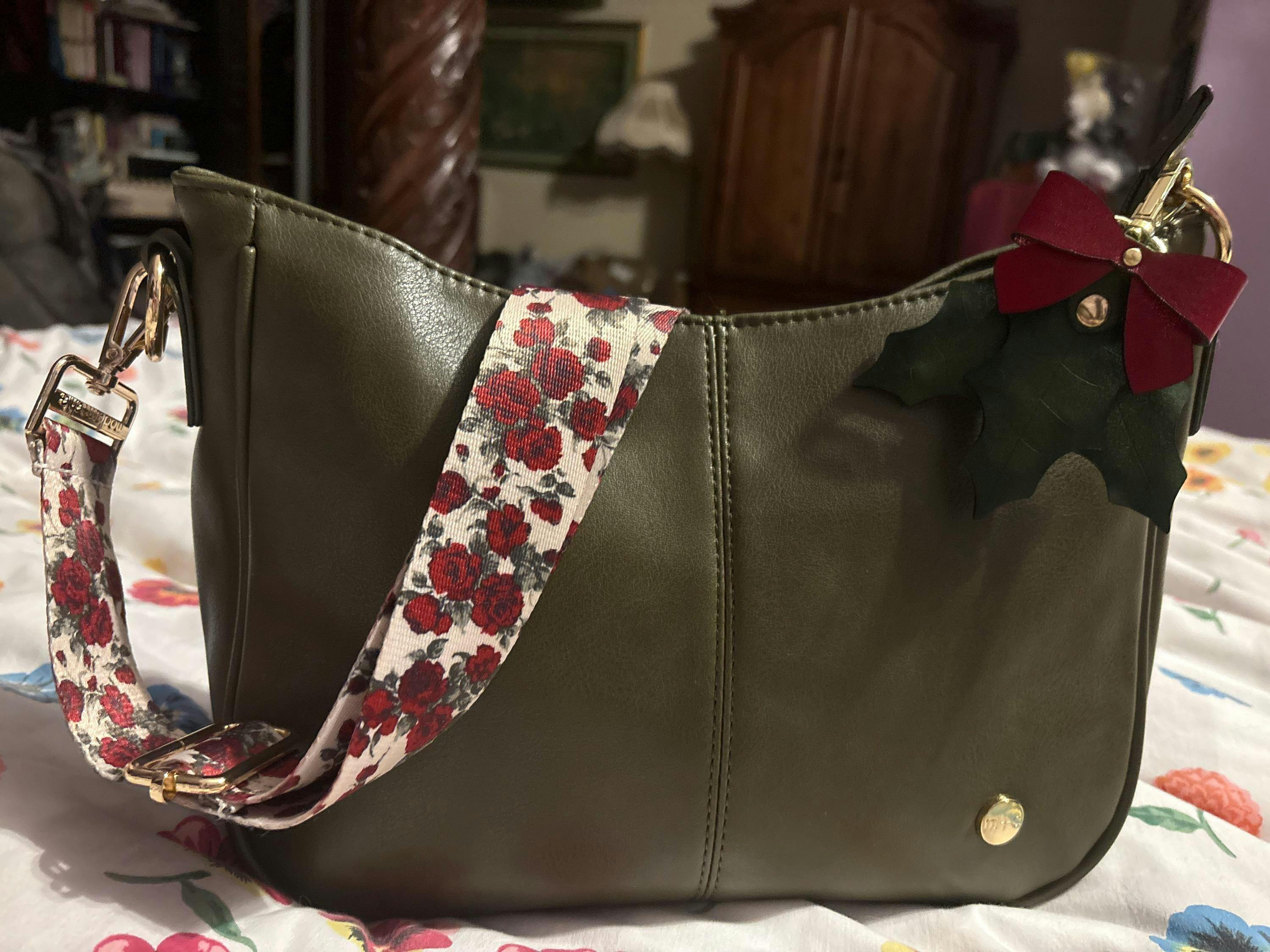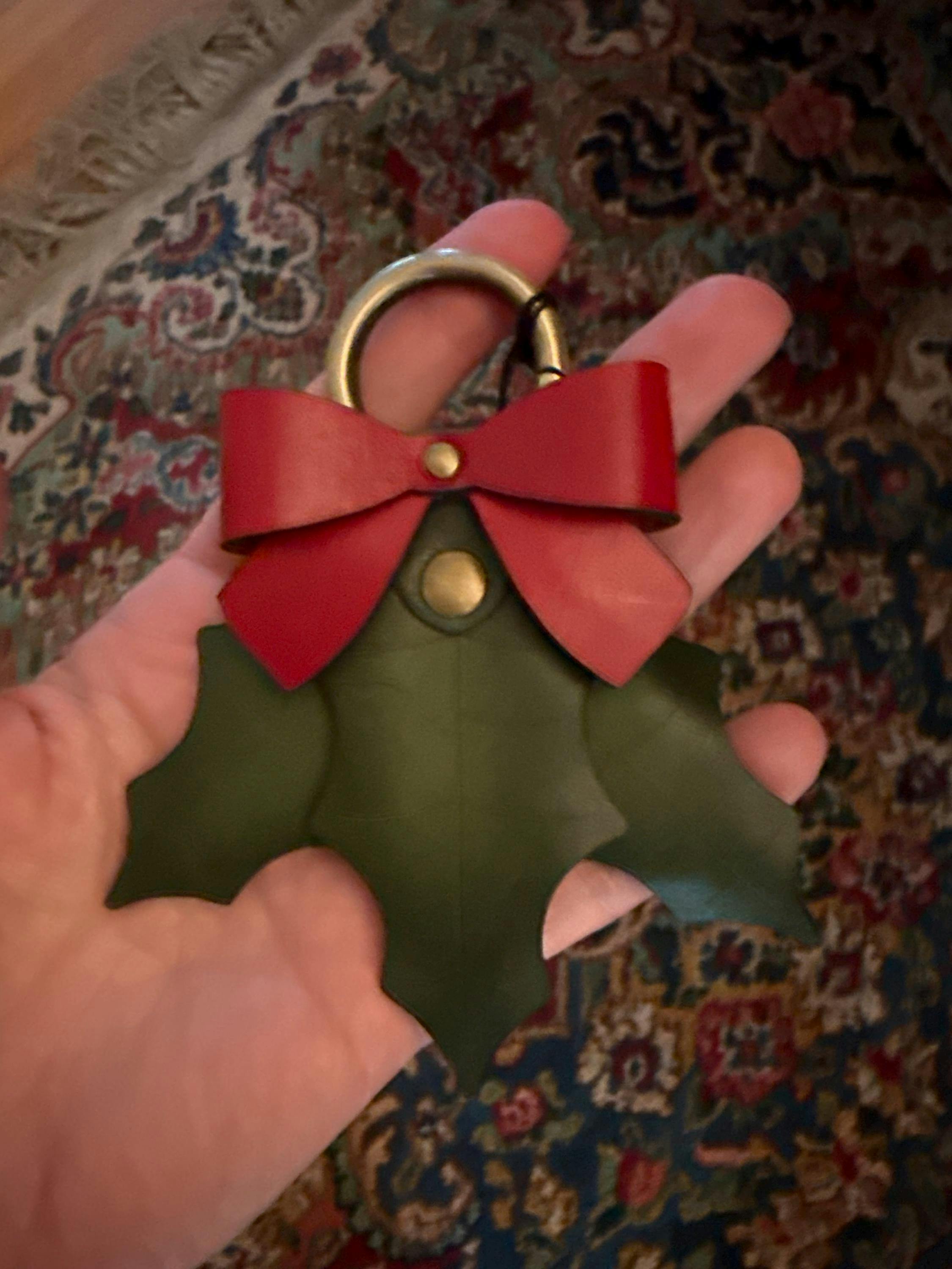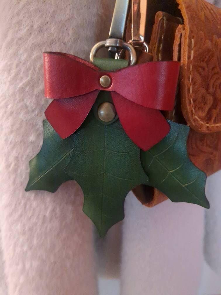 Carry the magic of Christmas with our Holly leaf leather bag charms. Inspired by the rich greens of winter foliage with a striking hand shaped red bow, this beautiful bag charm brings a hint of holiday warmth to any bag or key ring.