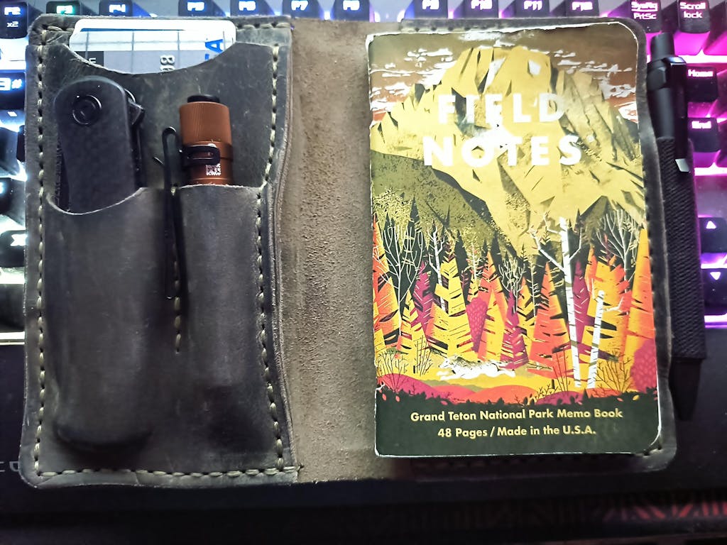 The main body of the Ranger is a journal cover that will fit standard pocket notebooks such as Field Notes, Moleskine Cahier or similar. On the inside cover are two tool slots for your favorite pocket knife and tucked behind that is a minimalist card wallet slot.