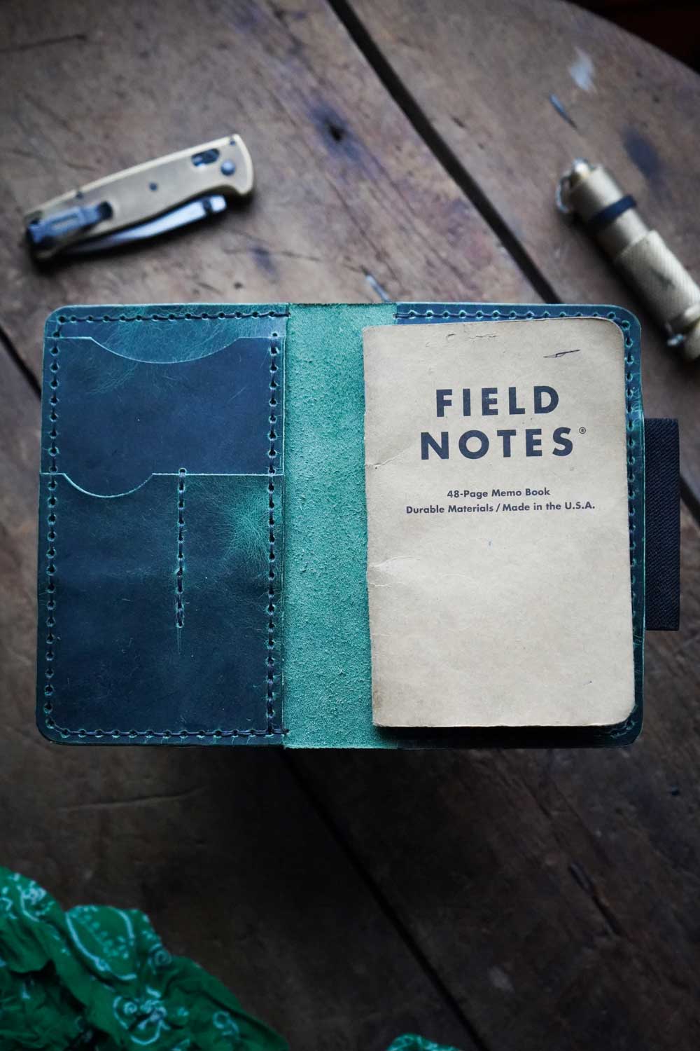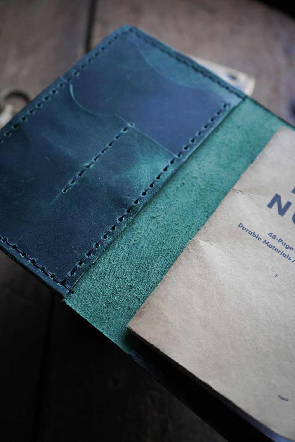 The main body of the Ranger is a journal cover that will fit standard pocket notebooks such as Field Notes, Moleskine Cahier or similar. On the inside cover are two tool slots for your favorite pocket knife and tucked behind that is a minimalist card wallet slot.