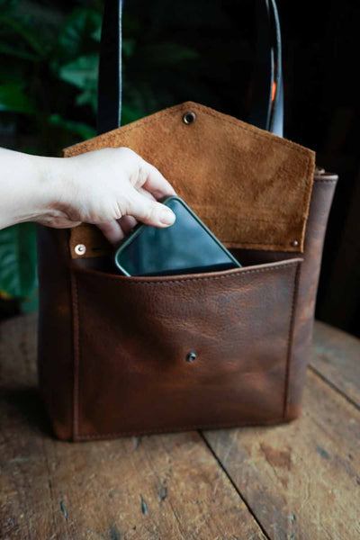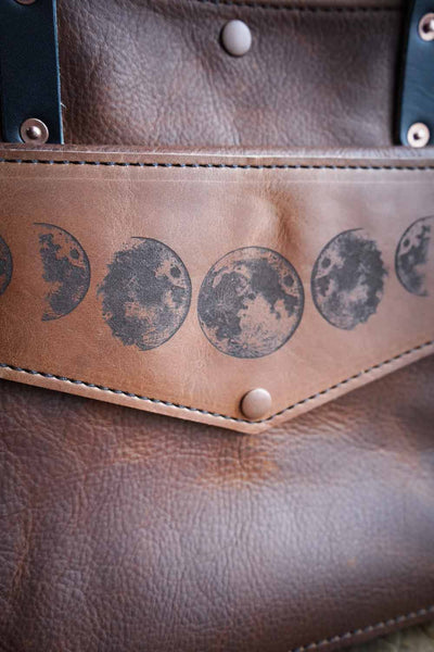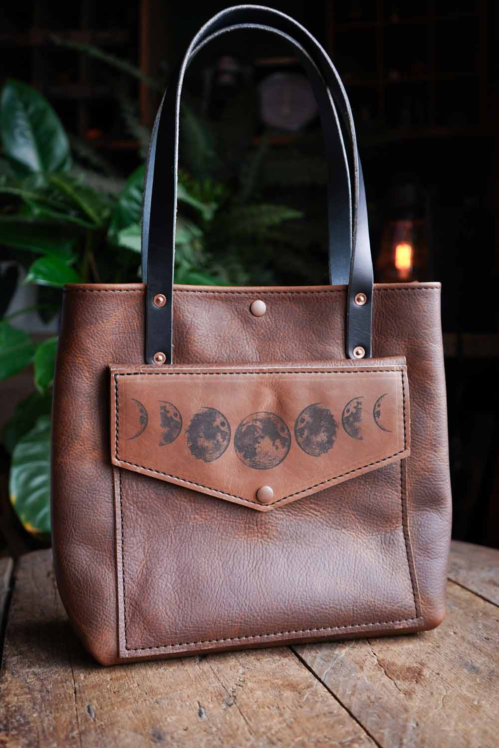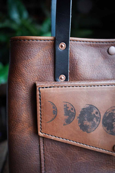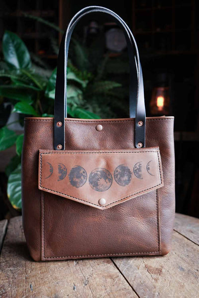 Pockets make everything better, but add a moon phase and you're in a whole other galaxy! Our Mini Leather Tote got an upgrade with an engraved moon phase flap atop the easy access front pocket, perfect for your phone or anything else you need on the go.